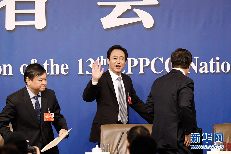 3月10日8时45分,全国政协十三届一次会议在梅地亚中心多功能厅举行记者会,邀请5位全国政协委员就“提高保障和改善民生水平”回答记者提问。图为记者会结束后,许家印与记者们挥手告别。新华网/中国政府网 翟子赫 摄