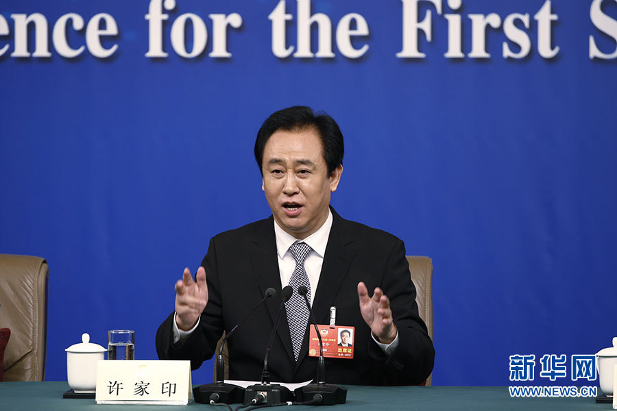 3月10日8时45分,全国政协十三届一次会议在梅地亚中心多功能厅举行记者会,邀请5位全国政协委员就“提高保障和改善民生水平”回答记者提问。图为许家印回答记者提问。新华网/中国政府网 陈杰 摄