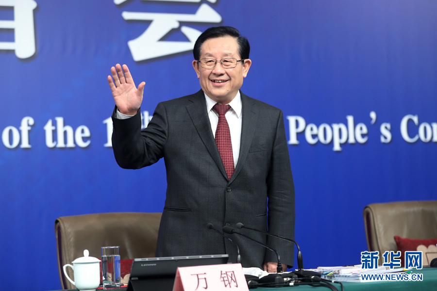 十三届全国人大一次会议新闻中心于10日上午10时45分在梅地亚中心多功能厅举行记者会,邀请科技部部长万钢、政策法规与监督司司长贺德方、创新发展司司长许倞就“加快建设创新型国家”相关问题回答中外记者提问。图为万钢向记者示意。新华网/中国政府网 翟子赫 摄