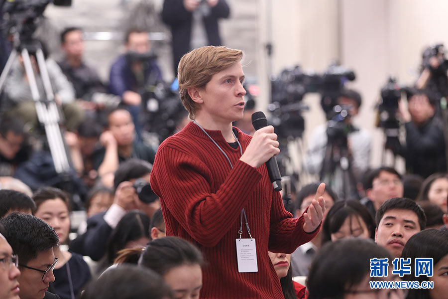 3月11日,十三届全国人大一次会议新闻中心在人民大会堂一楼新闻发布厅举行记者会,邀请十三届全国人大一次会议秘书处法案组组长、全国人大常委会法工委主任沈春耀,法案组副组长、全国人大常委会法工委副主任郑淑娜就“宪法修正案”相关问题回答中外记者提问。图为路透社记者提问。新华网/中国政府网 翟子赫 摄