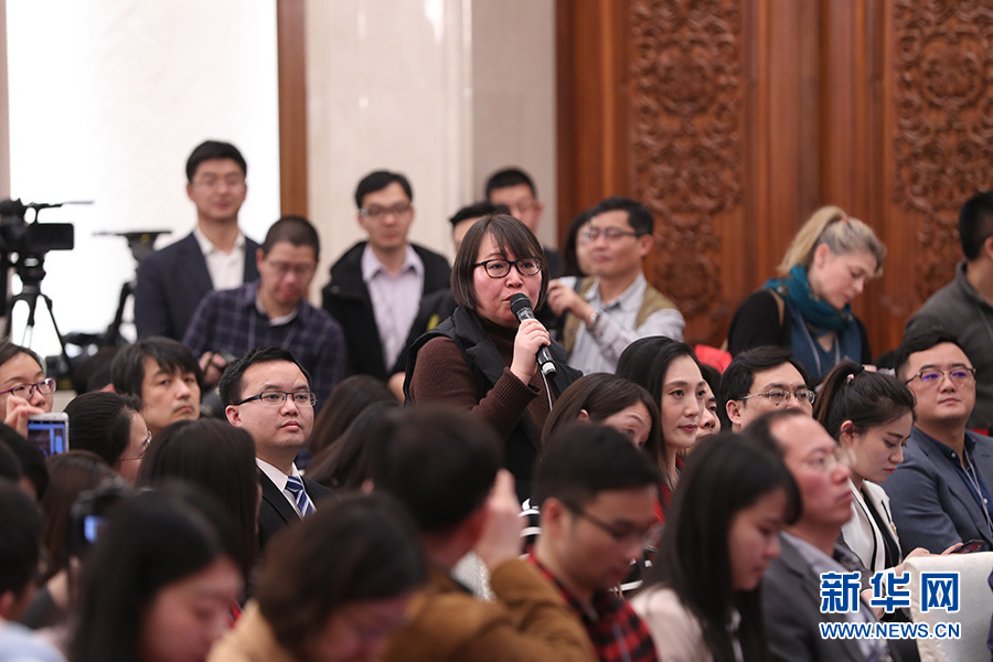 3月11日,十三届全国人大一次会议新闻中心在人民大会堂一楼新闻发布厅举行记者会,邀请十三届全国人大一次会议秘书处法案组组长、全国人大常委会法工委主任沈春耀,法案组副组长、全国人大常委会法工委副主任郑淑娜就“宪法修正案”相关问题回答中外记者提问。图为新京报记者提问。新华网/中国政府网 陈杰 摄