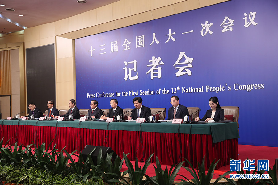 十三届全国人大一次会议新闻中心于3月12日15时在梅地亚中心多功能厅举行记者会,邀请十二届全国人大财经委副主任委员尹中卿、教科文卫委副主任委员吴恒、环资委副主任委员袁驷、内司委委员郑功成,全国人大常委会预算工委副主任刘修文、常委会办公厅秘书局巡视员傅文杰就“人大监督工作”相关问题回答中外记者提问。图为记者会现场。新华网/中国政府网 陈杰 摄
