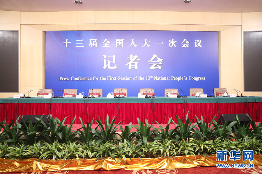 3月12日,十三届全国人大一次会议新闻中心在梅地亚中心多功能厅举行记者会,邀请十二届全国人大内司委副主任委员王胜明、财经委副主任委员乌日图、教科文卫委副主任委员吴恒、环资委委员吕彩霞,全国人大常委会法工委副主任王超英、副主任许安标就“人大立法工作”相关问题回答中外记者提问。图为记者会开始前。新华网/中国政府网 翟子赫 摄