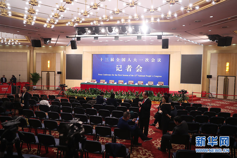 3月12日,十三届全国人大一次会议新闻中心在梅地亚中心多功能厅举行记者会,邀请十二届全国人大内司委副主任委员王胜明、财经委副主任委员乌日图、教科文卫委副主任委员吴恒、环资委委员吕彩霞,全国人大常委会法工委副主任王超英、副主任许安标就“人大立法工作”相关问题回答中外记者提问。图为记者会开始前。新华网/中国政府网 翟子赫 摄