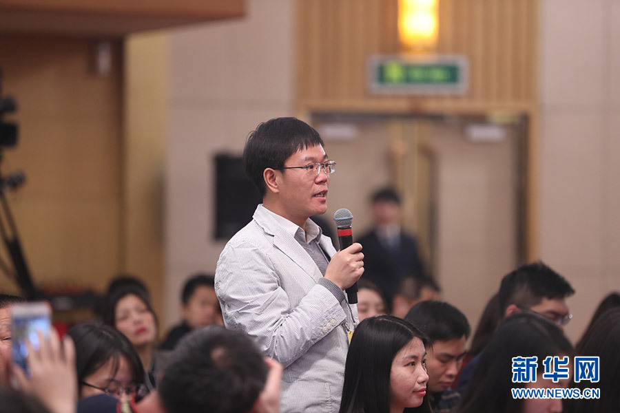 3月12日,十三届全国人大一次会议新闻中心在梅地亚中心多功能厅举行记者会,邀请十二届全国人大内司委副主任委员王胜明、财经委副主任委员乌日图、教科文卫委副主任委员吴恒、环资委委员吕彩霞,全国人大常委会法工委副主任王超英、副主任许安标就“人大立法工作”相关问题回答中外记者提问。图为瞭望周刊记者提问。新华网/中国政府网 翟子赫 摄