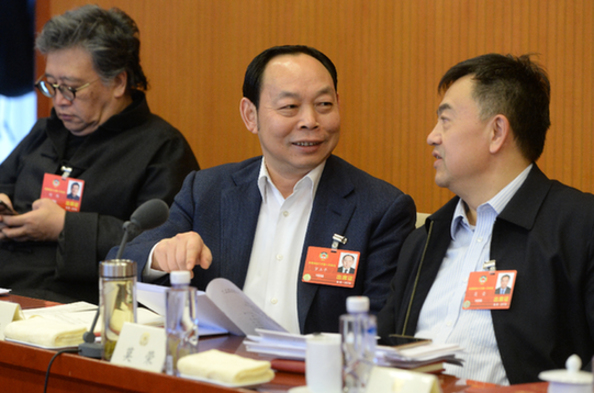 图为全国政协委员、民建贵州省委副主委、中天金融集团董事长罗玉平(中)参加小组讨论。