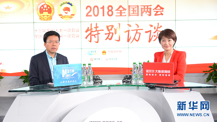 图为全国政协委员,陕西建工集团有限公司党委书记、董事长、总经理张义光(左)做客新华网2018全国两会特别访谈。新华网 杨濛摄