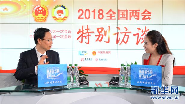 3月14日,全国人大代表、南京市市长蓝绍敏(左)做客新华网2018全国两会特别访谈。新华网 杨濛摄