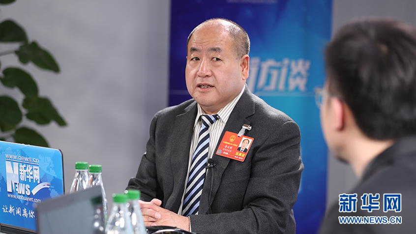3月15日,全国人大代表、颈复康药业集团董事长李沈明(左)做客新华网2018全国两会特别访谈。新华网 郭小天摄