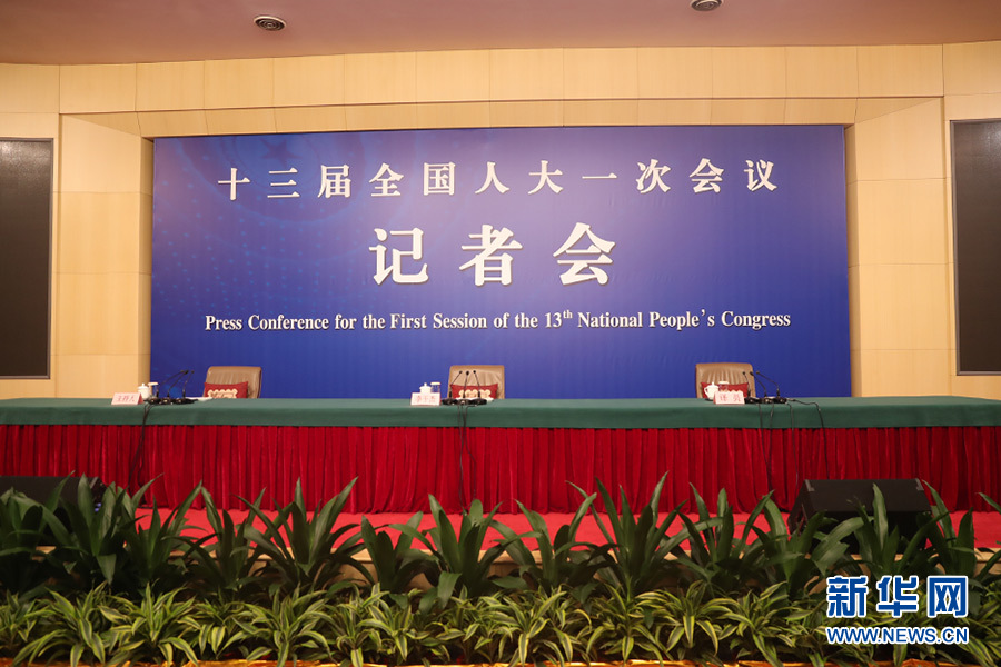 十三届全国人大一次会议新闻中心3月17日(星期六)15时在梅地亚中心多功能厅举行记者会,邀请环保部部长李干杰就“打好污染防治攻坚战”相关问题回答中外记者提问。图为记者会开始前。新华网/中国政府网 陈杰 摄