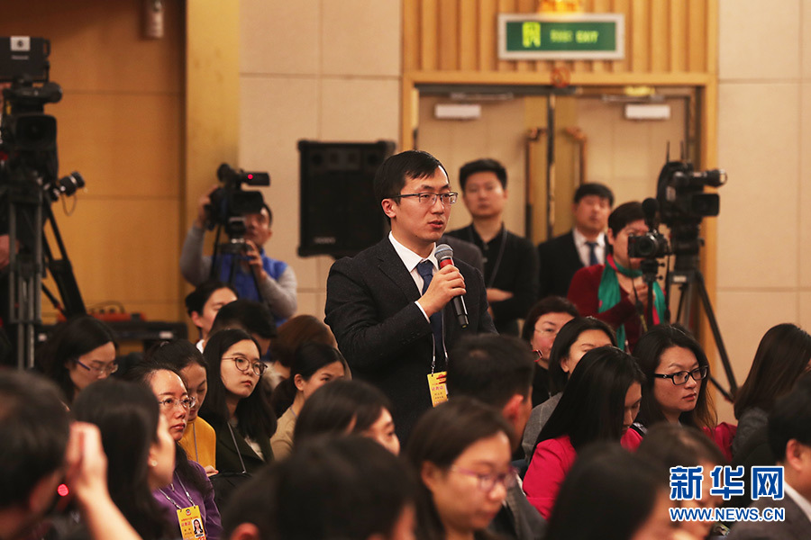 十三届全国人大一次会议新闻中心3月17日(星期六)15时在梅地亚中心多功能厅举行记者会,邀请环保部部长李干杰就“打好污染防治攻坚战”相关问题回答中外记者提问。图为法制日报记者提问。新华网/中国政府网 曲植 摄