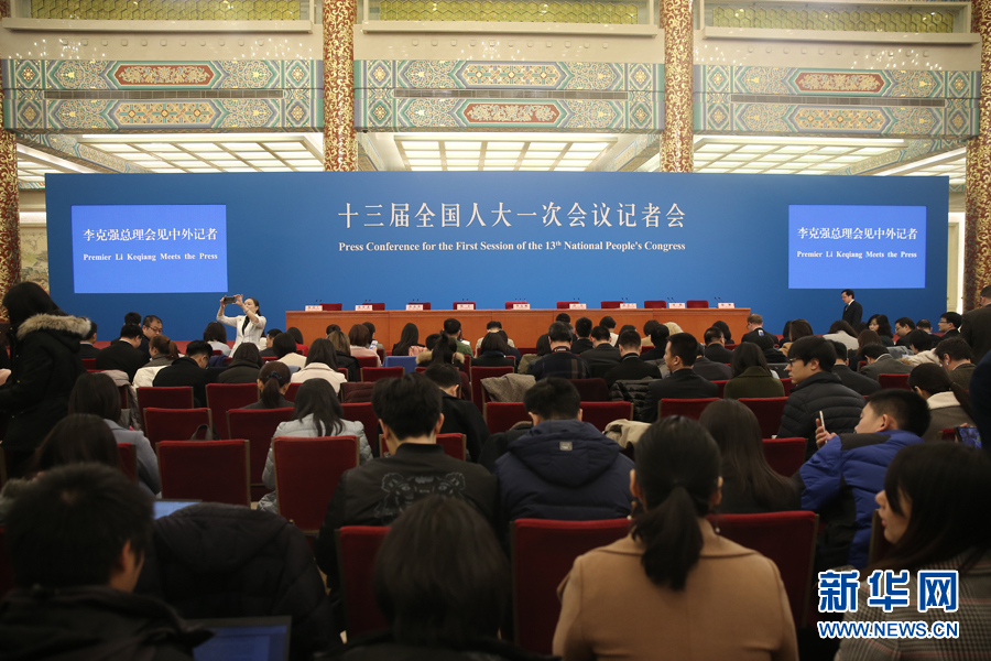 3月20日上午,十三届全国人大一次会议闭幕后,国务院总理李克强将在人民大会堂三楼金色大厅会见采访十三届全国人大一次会议的中外记者并回答记者提出的问题。图为记者会现场。 新华网/中国政府网 翟子赫 摄
