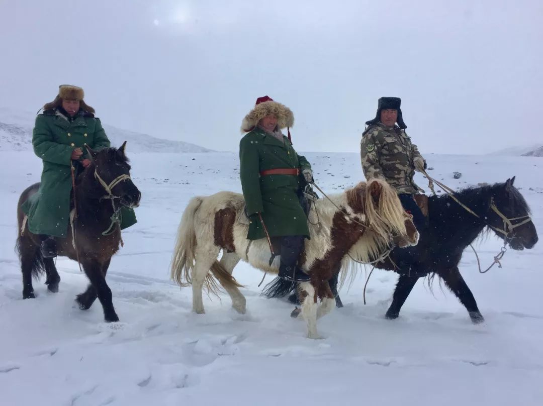 2018-12-19,新疆阿勒泰地区。在新疆阿勒泰地区查干郭勒乡江布塔斯村,三名哈萨克族牧民冒着零下近三十度的严寒,巡视着祖国的边境线。作者:金牛山大街