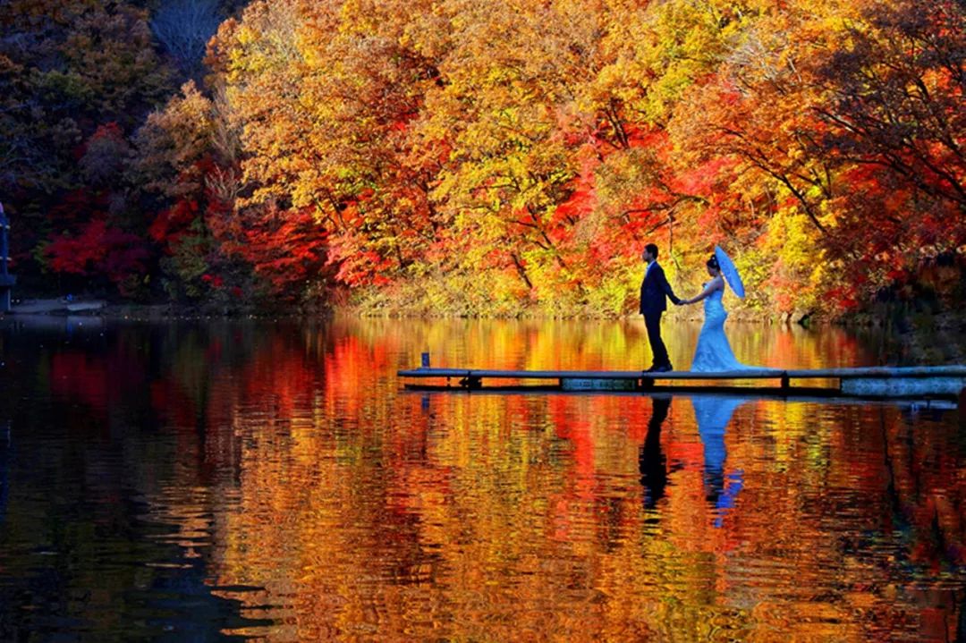 2018-10-18,辽宁本溪市关门山风景区。关门山是我国赏枫的著名旅游景区,恰巧拍到一对拍婚纱照的恋人。作者:laner