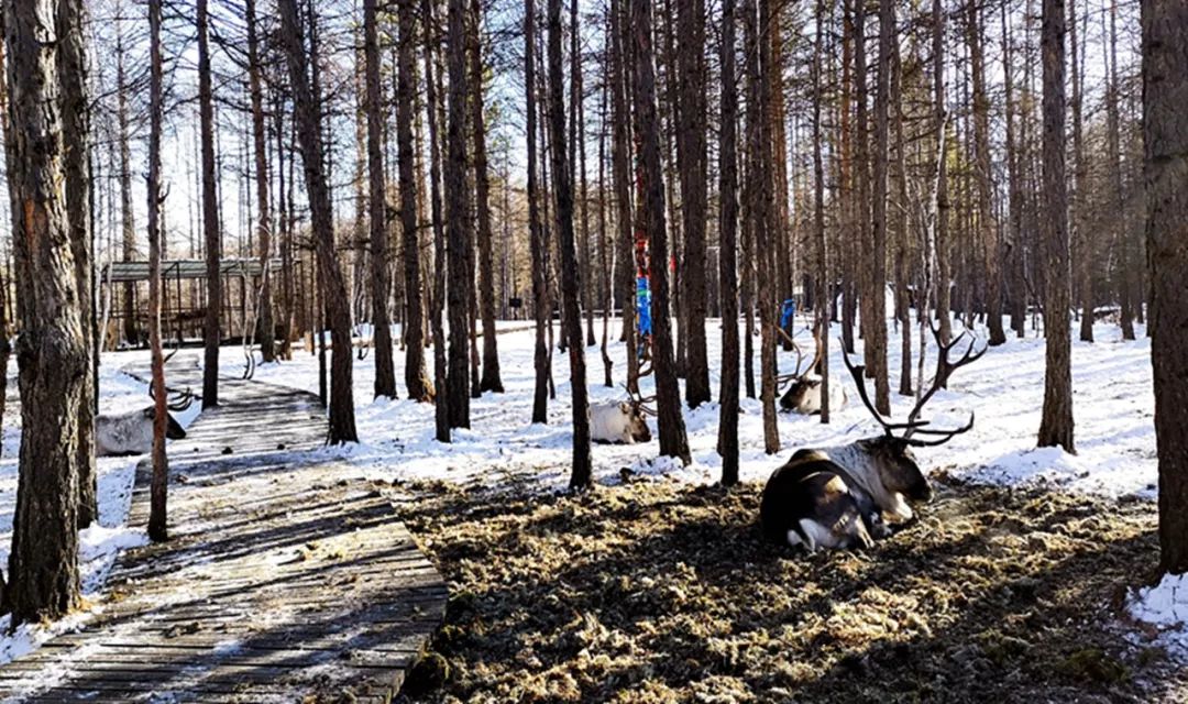 2018-11-01,内蒙古呼伦贝尔根河市。有着“林海之舟”美称的驯鹿,安静地享受着冬日清晨的阳光。作者:刘涛