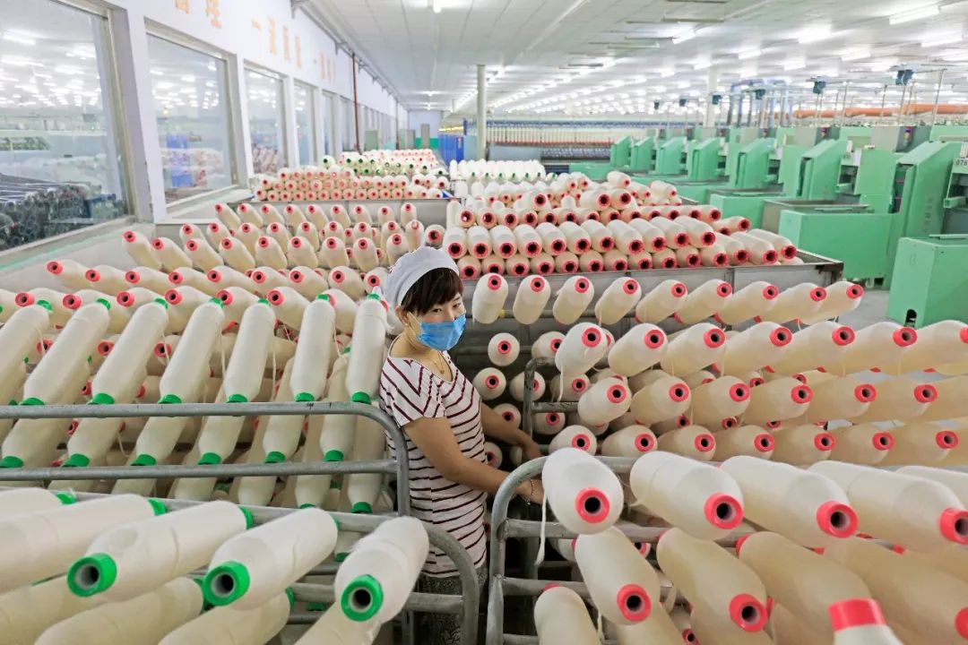 2018-09-11,河北滦南。滦南县通过技改升级,打造出优质精品纺纱产业集群,一名女工正在纺纱生产线上工作。作者:广角镜