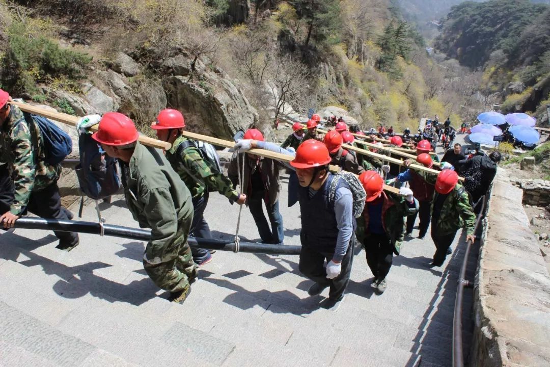2018-04-16,山东泰安。因施工需要,百名电力工人抬着百米电缆历尽险难,拾级而上,用时八个多小时,终于登上泰山顶峰。作者:晨风