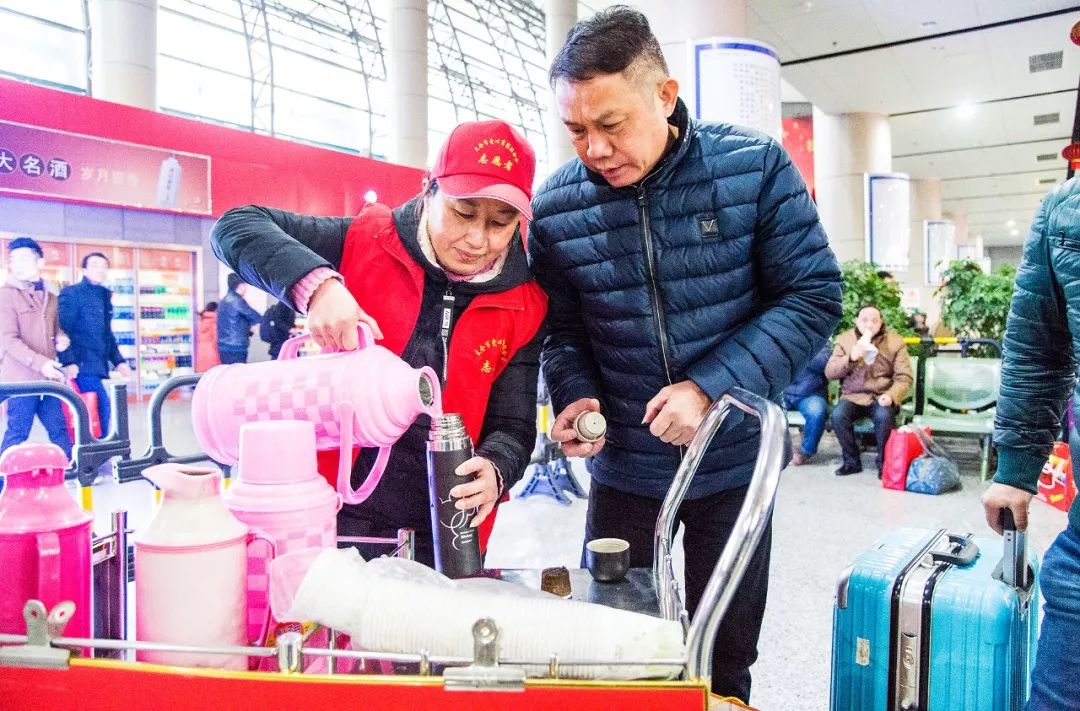 2018-02-15,江苏太仓。太仓汽车站,志愿者为春节回家过年的旅客送来了热水。作者:漫画旅馆