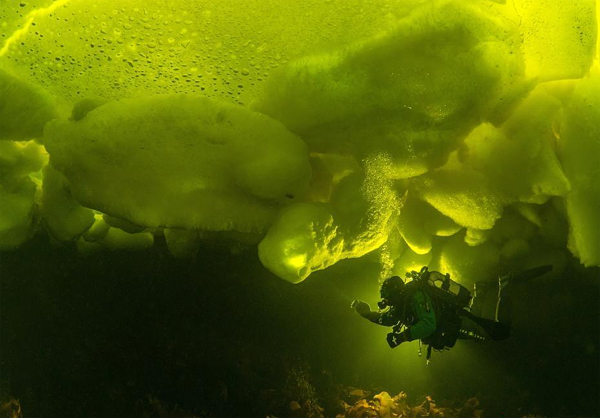潜水员探索冰下海底世界宛如科幻照片