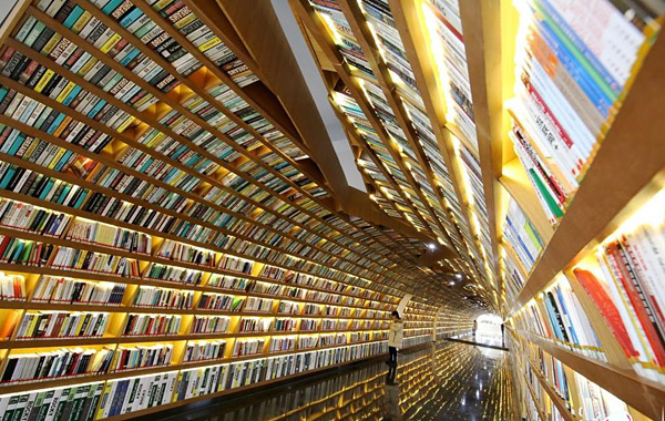 郑州高校现“书海隧道” 头顶身侧全是书