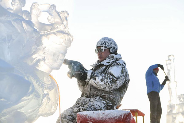 1月2日,选手在哈尔滨冰雪大世界内制作冰雕。当日,第八届中国哈尔滨国际组合冰雕比赛在哈尔滨冰雪大世界进行第三天的比赛。本届比赛有来自中国、西班牙、意大利、俄罗斯等12个国家和地区的16支代表队、64名队员参赛。