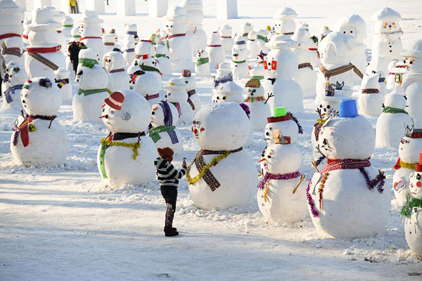 1月2日,一名游客在拍摄雪人。2019个各式各样的雪人,近日在冰城哈尔滨市的松花江畔亮相,引来众多市民游客游玩观赏。