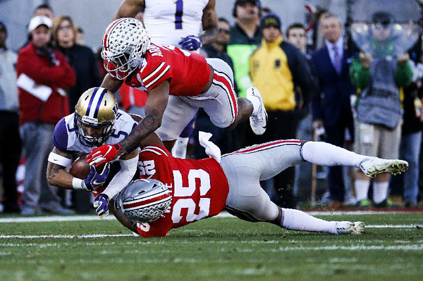 1月1日,华盛顿大学队球员安德烈 (前左) 在比赛中进攻受阻。当日,在第105届“玫瑰碗”美式橄榄球赛中,俄亥俄州立大学队以28比23战胜华盛顿大学队。“玫瑰碗”美式橄榄球赛是美国传统的新年庆祝活动,每年的1月1日在加利福尼亚州帕萨迪纳市玫瑰碗体育场举行。