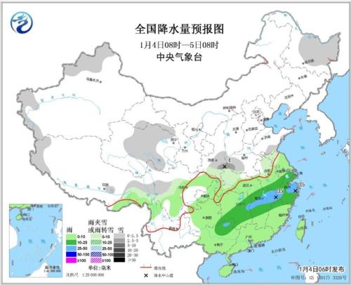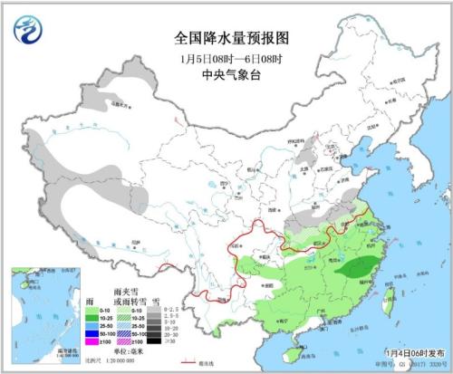受高空槽影响,4日至5日,陕西南部、河南南部、山东南部、苏皖北部、湖北西部等地有小雪或雨夹雪,局地有中到大雪;南方大部地区有小到中雨,江西中北部、浙江中部等地的部分地区有大雨。