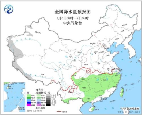 1月4日08时至5日08时,黑龙江中东部、北疆北部和南疆西部山区、青海中东部、西藏东部和西部、川西高原、陕西中南部、湖北西部、黄淮西部和东南部等地的部分地区有小雪或雨夹雪;江汉、江淮及其以南大部地区、西南地区东部和南部等地的部分地区有小到中雨,江西中北部、浙江中部和广西东北部等地的部分地区有大雨(25~35毫米)。内蒙古中北部、黑龙江东北部、辽东半岛和山东半岛等地的部分地区有4~6级及以上风(见图1)。北部湾、琼州海峡、广东西部沿岸部分海域将有大雾天气。