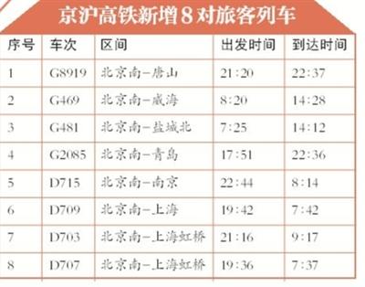 记者从北京铁路局获悉,调图后,京沪高铁将增加8对旅客列车,分别为北京南至唐山、威海、盐城北、青岛、南京、上海各1对,至上海虹桥动车组2对。