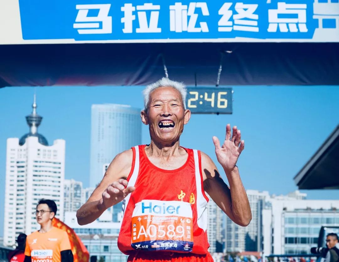 2018-10-28,青岛。一名白发老人完成马拉松后很开心。作者:feng