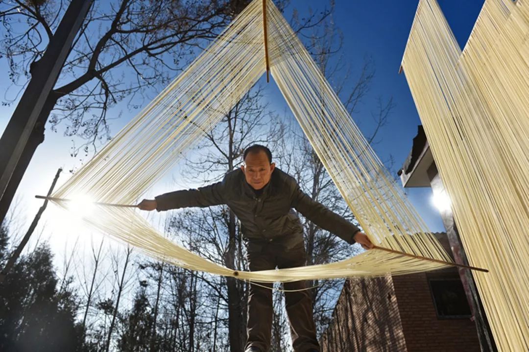 2018-12-13,河南灵宝。川口乡闫谢村李润泽正在自家院子里制作挂面。作者:紫色光
