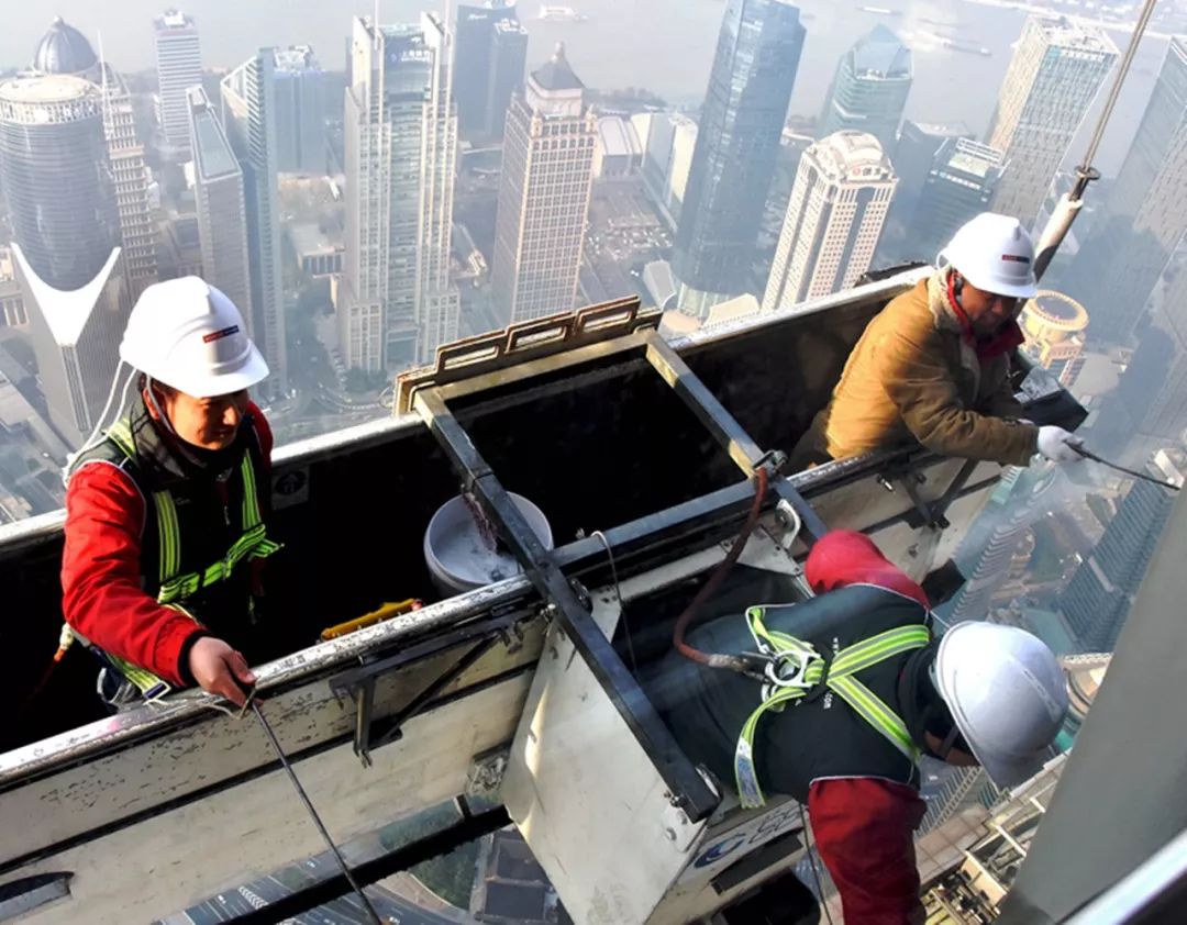 2018-12-13,上海。上海环球金融中心大厦外墙450米高空作业的清洁工,被陆家嘴金融中心众多高大楼宇包围,成了“中心”之中的中心。作者:孙家录