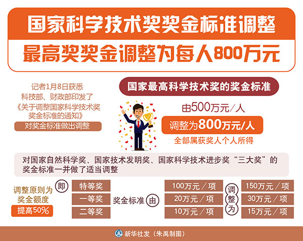 图表:国家科学技术奖奖金标准调整 最高奖奖金调整为每人800万元 新华社发 朱禹 制图