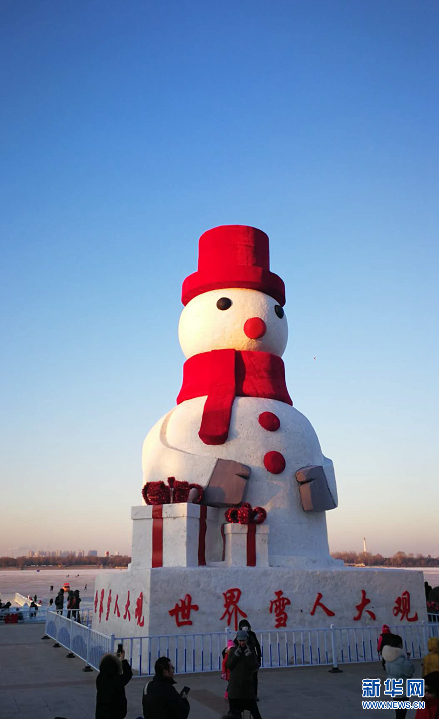 坐落在松花江畔的巨型雪人高20米,引众人驻足拍照。 新华网记者 张明宇 摄