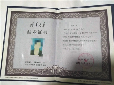 新京报记者查询到,所谓的“毕业证书”是清华大学继续教育处颁发的。而清华大学继续教育处工作人员则表示,继续教育处每年举办很多培训项目,会发放结业证书,而不是毕业证书。