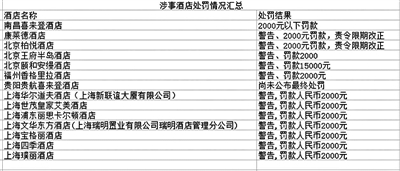 北京青年报记者调查发现,涉事的14家酒店中,12家均被处以警告和2000元或以下的罚款,唯有一家酒店被处以15000元的罚款处罚,官方表示,北京海淀区的一家涉事酒店被处15000元罚款是因为其“逾期不改正”。对于处罚金额,包括“花总”在内的不少网友都感到“不给力”,“花总”向北青报记者表示,希望此次事件可以推动相应法规与时俱进。专家表示,遭受处罚本身就对这些五星级酒店的品牌声誉和用户忠诚度造成了极大的损害,它们实际的损失远比明面上的罚款要大得多。