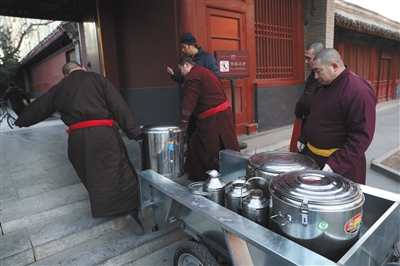雍和宫内僧人们搬运连夜熬制的腊八粥。
