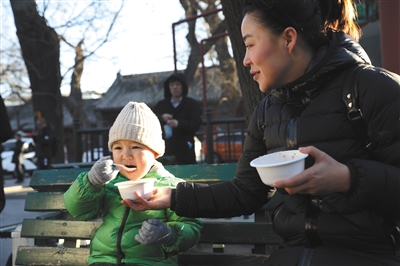 代女士已经连续13年来雍和宫喝腊八粥了。她说,自己怀孕时偶然赶上雍和宫舍粥,因为自己是高龄产妇,许愿“母子平安”。随后每年腊八她都带上家人来喝上一碗粥,今年恰逢周末,她就带上儿子一起来,“参与这个节日已经成了我们家的传统,每年来这里祈福纳祥。”(记者 张彤 摄影/记者 王飞)