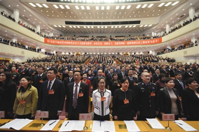 昨日,北京市第十五届人民代表大会第二次会议开幕,全体起立唱国歌。当天,市人代会在北京会议中心召开,市长陈吉宁作政府工作报告。新京报记者 吴江 摄