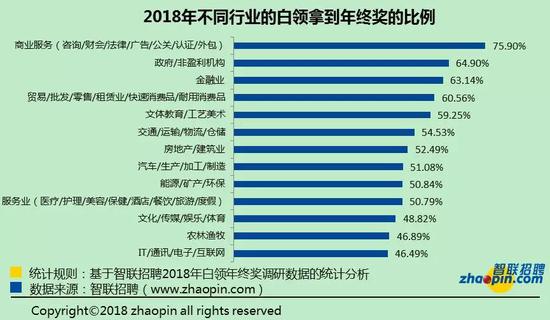 从行业角度看,商业服务行业的白领能拿到年终奖的比例最多,为75.90%,其次是政府/非营利机构和金融业,分别为64.90%和63.14%,IT/通讯/电子/互联网行业垫底,仅有46.49%的白领能拿到年终奖,风光不再。2018年对互联网/通讯等行业来说不太友好,裁员、冻编缩减预算过冬,年终奖自然也受到牵连。