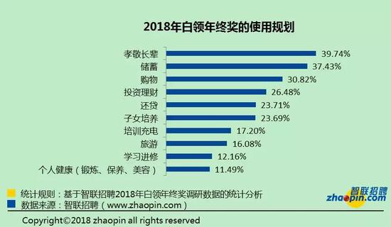 调研数据显示,白领们在拿到年终奖后,选择“孝敬长辈”的比例最多,达39.74%;其次是“储蓄”和“购物”;此外,“投资理财”、“还贷”“子女培养”也是年终奖的主要使用方式。年终奖作为白领辛苦一年的肯定,每一分钱都很珍贵,使用方式也很有爱。
