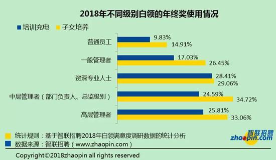 企业管理层的白领比较注重“子女培养”和“培训充电”,这两项的年终奖使用比例分别为33.06%和25.81%,中层管理者的选择这两项的比例也高达34.72%和24.59%,而普通员工仅有14.91%和9.83%选择这两项,可以看出,职级越高越上劲,不仅自己要更优秀,也注重为子女提供高质量的教育。