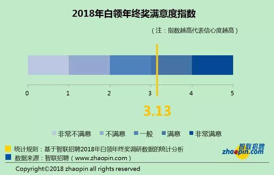 调研数据显示,2018白领年终奖满意度为3.13,虽然相较于2017年的3.32有一定程度的下滑,但是仍然过了及格线,高于2016年的2.18和2015年的2.07。由于2018年的经济形势,很多企业年终奖有一定的缩减,因此白领们对年终奖的满意度相较去年有所下降。