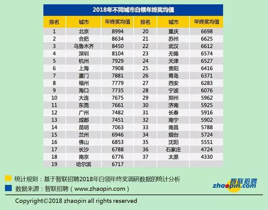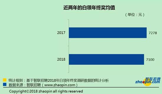调研数据显示,2018年全国白领年终奖总体均值为7100元,低于2017年的7278元。