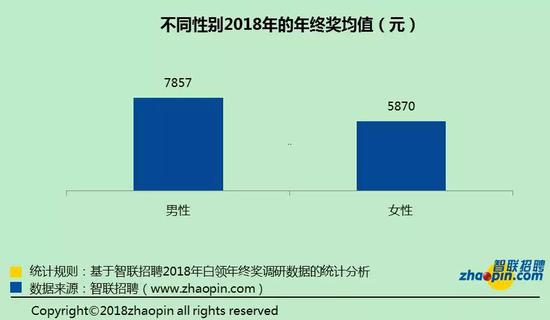 2018年,男性员工的年终奖均值为7857元,女性为5870元,男性比女性的年终奖高出3成。智联招聘发布的《2018中国女性职场现状调查报告》数据显示,女性的整体收入比男性低22%,这也和年终奖的调研情况基本保持一致,对于同样辛苦一年的女性员工,企业也应该给予平等的尊重与奖励。