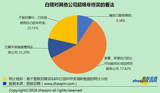 面对其他公司的超级年终奖,白领们的态度还是非常暖心的,57.82%的白领希望自己的公司发展壮大具备发放高额年终奖的实力,对现在的公司不离不弃。选择“不盲目攀比,已经很感恩自己的年终奖”的白领,占比21.51%,心态良好。超级年终奖对大多数白领来说都是“可望不可及”的梦想,因此白领们都知道与其羡慕,还不如撸起袖子加油干,同时感恩当下,深谙知足常乐的哲理。
