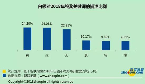 “爽”成为了2018年年终奖最重要的关键词,选择这一选项的白领为24.20%,选择“壕”的仅为9.51%,但是笑得出来的人并不多,觉得年终奖“坑”的觉得公司抠门的,甚至没有年终奖的大有人在。整体来看,只有少数白领笑到了最后,更多的白领在2018年只能全程陪跑。