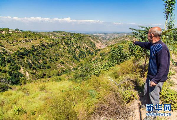 在山西省保德县南河沟乡中赵家墕村,“树痴”赵蛇则遥望染绿的山沟(2018年9月7日摄)。新华社发
