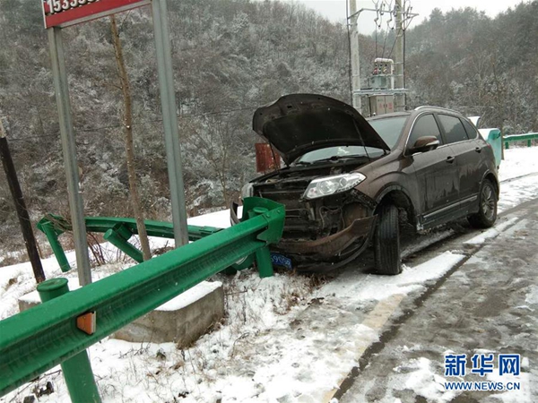 在湖北省十堰市李家湾村路段,因道路湿滑,返乡的李先生驾驶的小轿车一头冲向路边20余米的深沟,最后关头被路边钢制护栏拦住(1月9日摄)。新华社发(熊伟 摄)